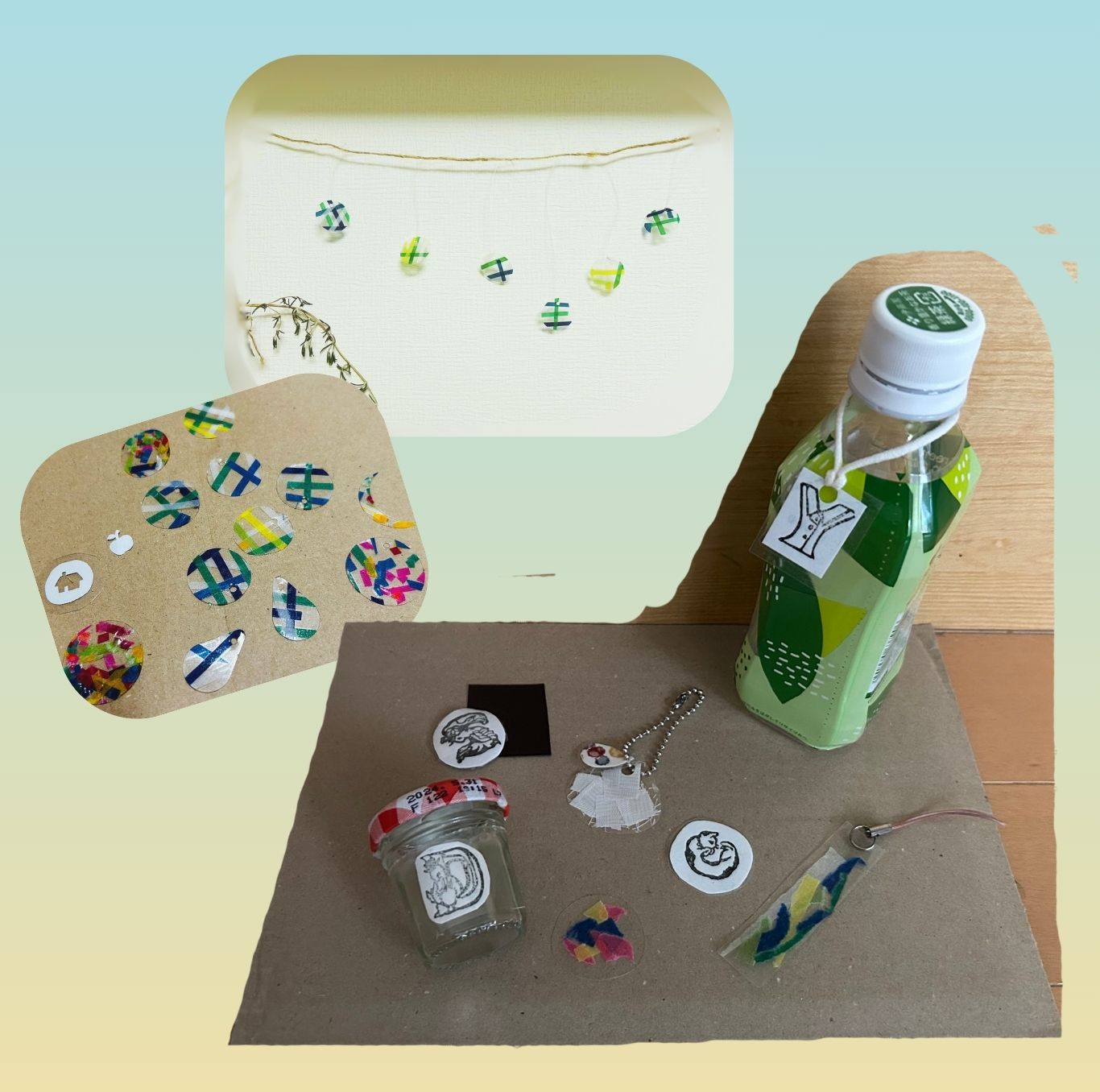 内容  本のブッカー(フィルム)をする際に余った端切れを使って、しおりやキーホルダーなど作品を作って遊びます。