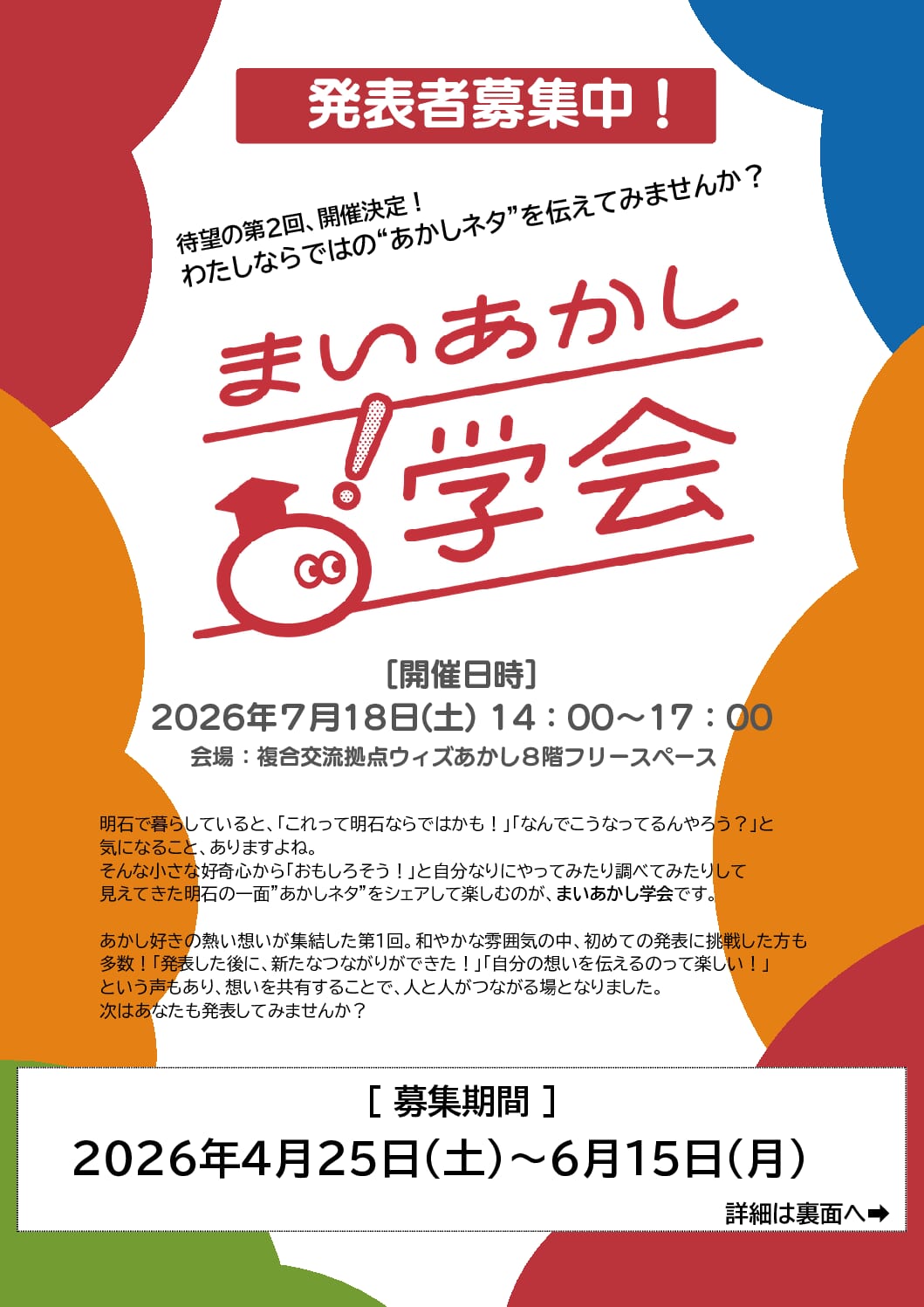 あかし好きの熱い想いが集結した第1回まいあかし学会から約半年…待望の第2回の開催が決定いたしました!